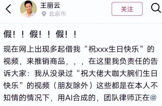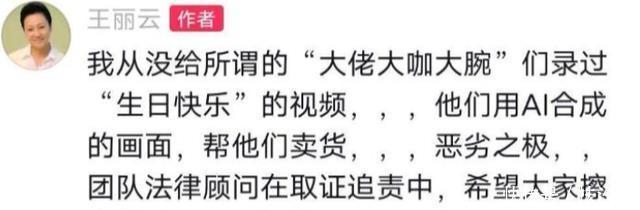 而且她女儿是车晓,也是大家熟悉的演员,母女俩在圈里口碑都不错。 可谁能想到,2025年11月26日,王丽云突然发文辟谣,字里行间全是无奈和愤怒。 她说“假!假!假!”,还说自己除了对朋友,从来没给什么“大佬大咖”录过生日祝福视频。 那些流传的视频,全是别人用AI合成的,甚至还用她的脸在直播间带货。